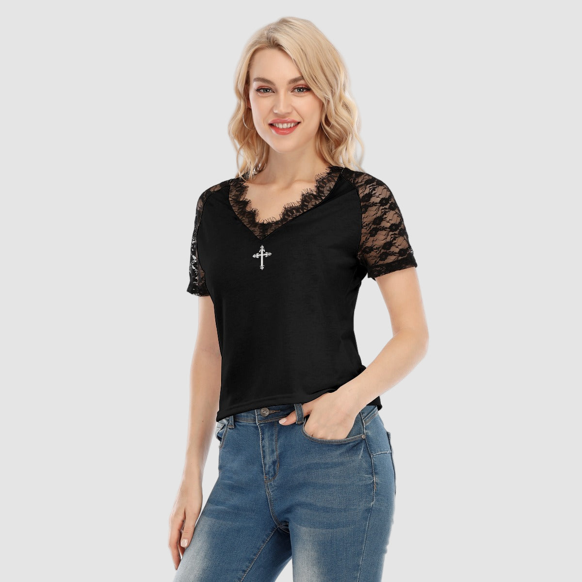 - Schwarze Spitze an den Rändern, V-Ausschnitt