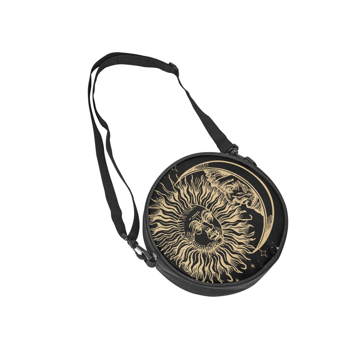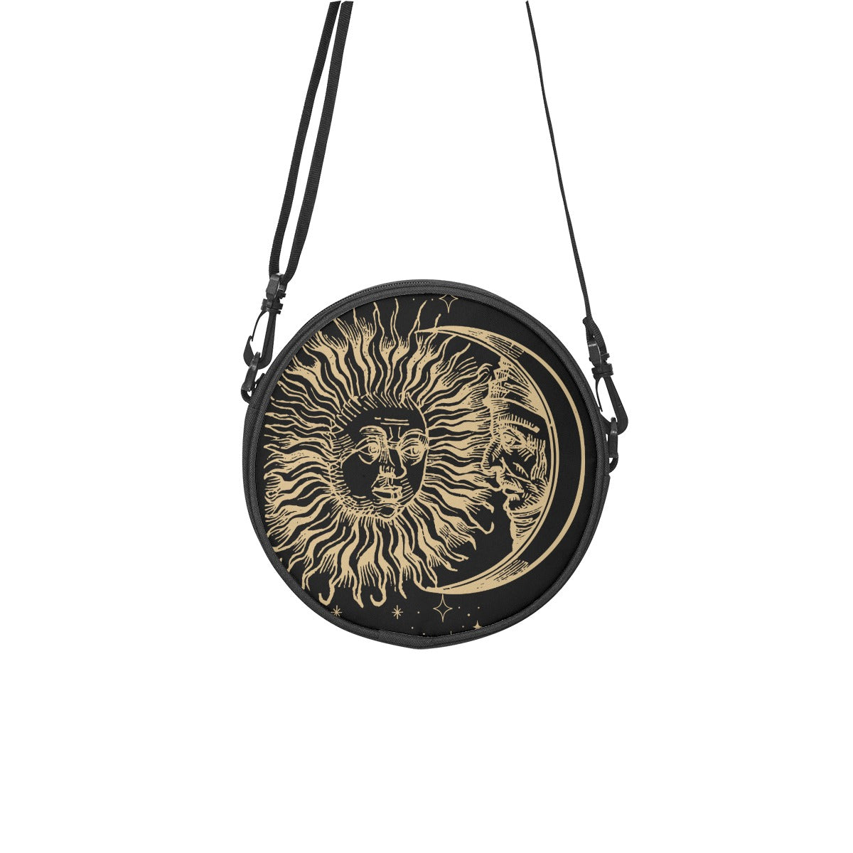 Schwarze runde Tasche mit Sonne-und-Mond-Motiv mystisches Design
